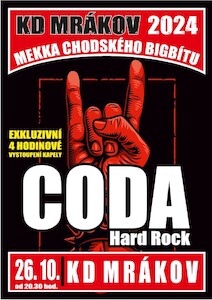 pro návštěvníky další hudební lahůdku. A to konkrétně poctivou nálož živelné hardrockové muziky legendární karlovarské party jménem Coda, která vypukne už poslední říjnovou sobotu – 26. 10. 2024 od 20:30 hodin. Můžeme se těšit na exkluzivní čtyřhodinový večer plný vypalovaček jako Já tě znám, Fair Play, Napůl nebo Ještě mě lásko hřej, což je
