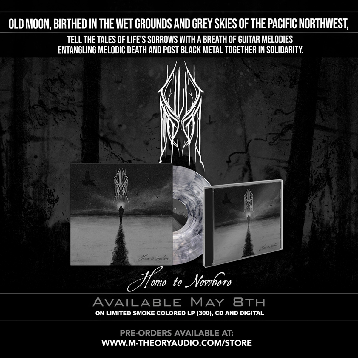 “A Rest To My Name” and “Obsidian” both come from the group’s forthcoming full-length debut, ‘Home To Nowhere’ out May 8th on CD, limited-edition (300) smoke colored vinyl and digital. Pre-Order now at www.m-theoryaudio.com/store or https://oldmoonmusic.bandcamp.com